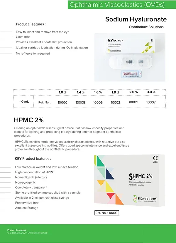 Low molecular weight and low surface tension High concentration of HPMC Non-antigenic (allergic) Non-pyrogenic Completely transparent Sterile pre-filled syringe supplied with a cannula Available in 2 ml luer-lock glass syringe Preservative-free Ambient Storage