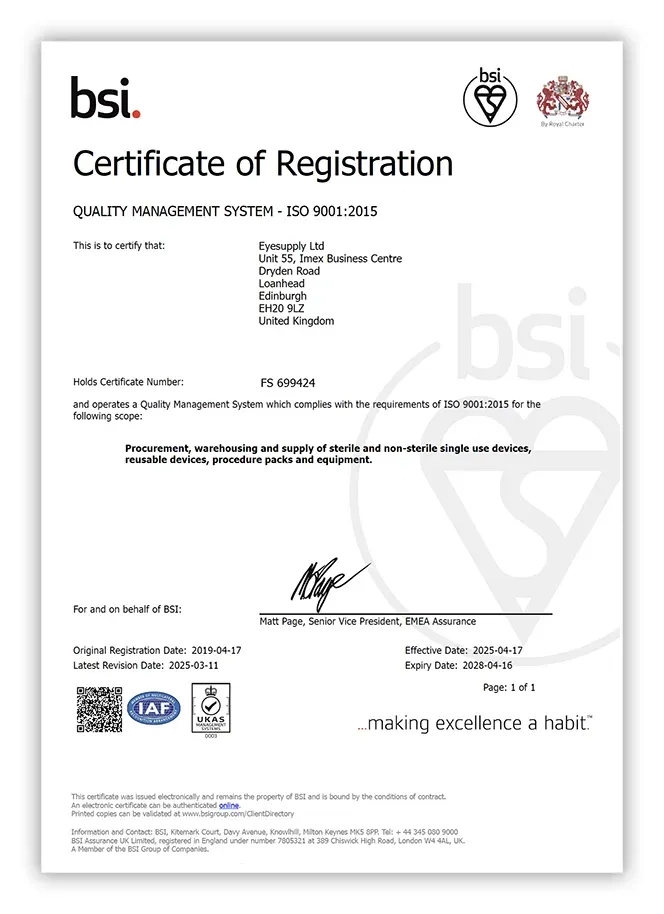 Eyesupply is committed to quality improvement and operates a Quality Management System which complies with the requirements of ISO 9001:2015 for the following scope: